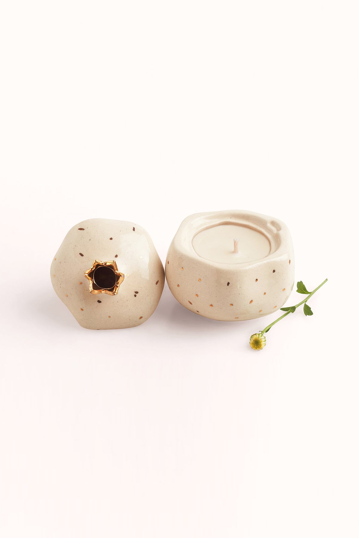 Hand poured with a warm, loving touch and finished with golden dots that dance in the candlelight, it's perfect for setting the mood or simply sitting pretty on your shelf. Whether lit or unlit, it’s a celebration in itself.