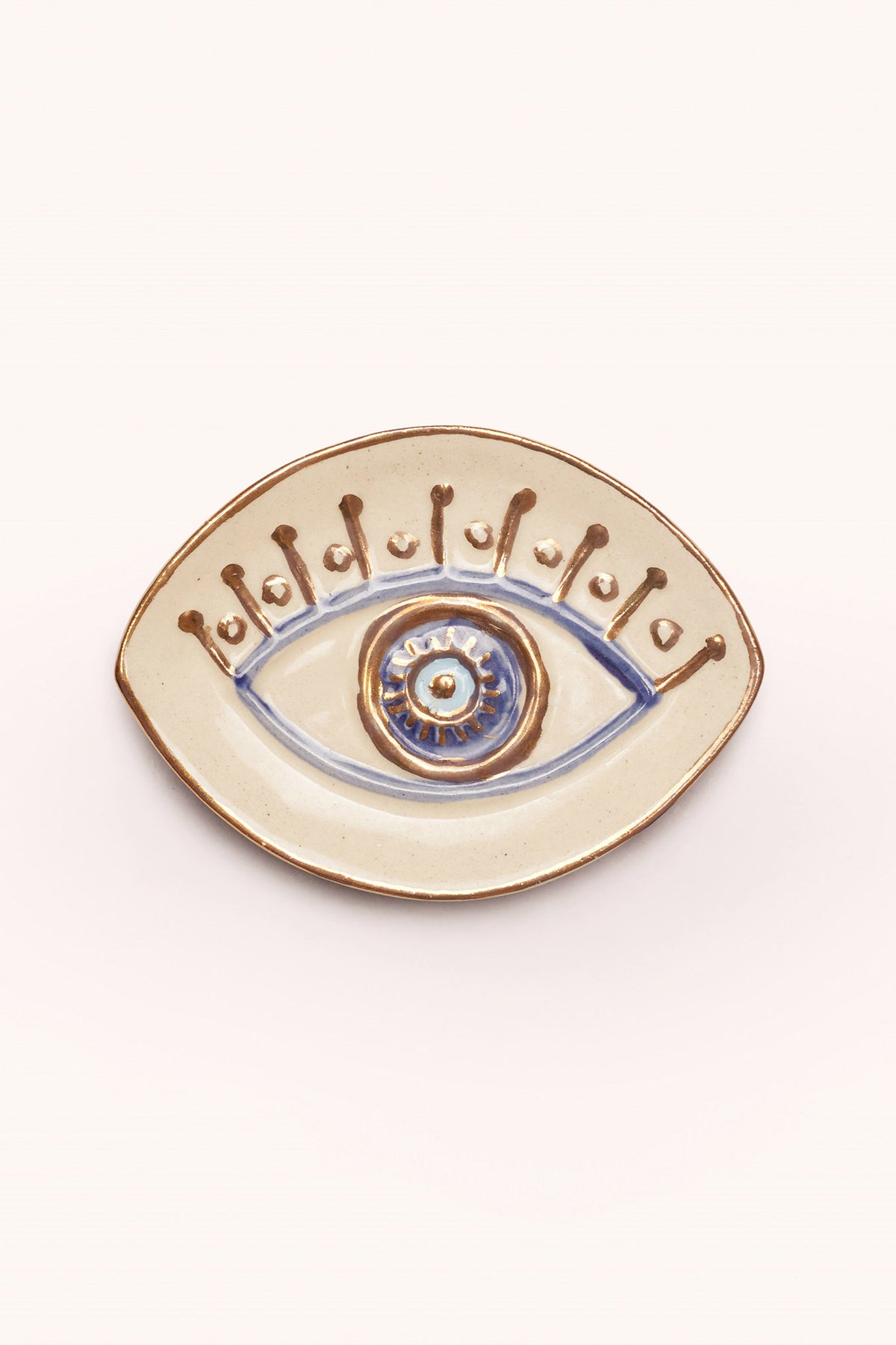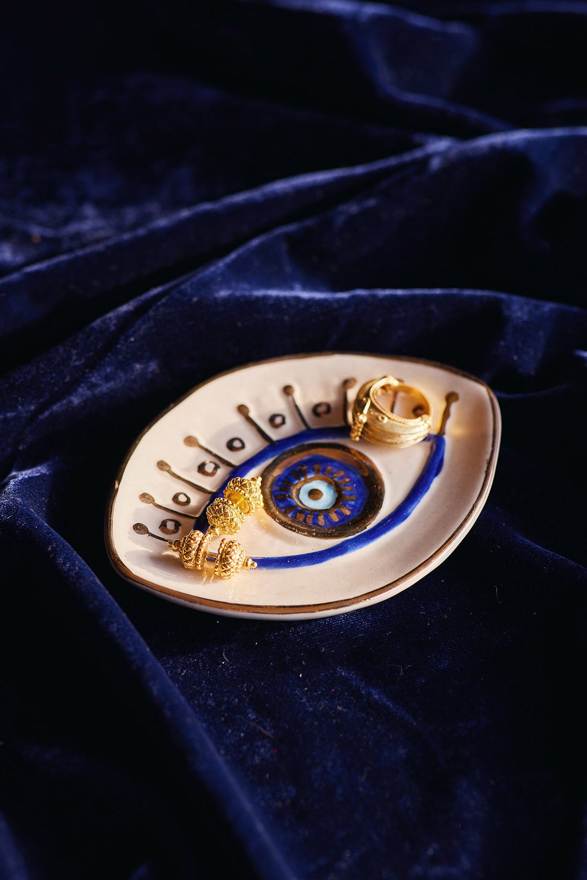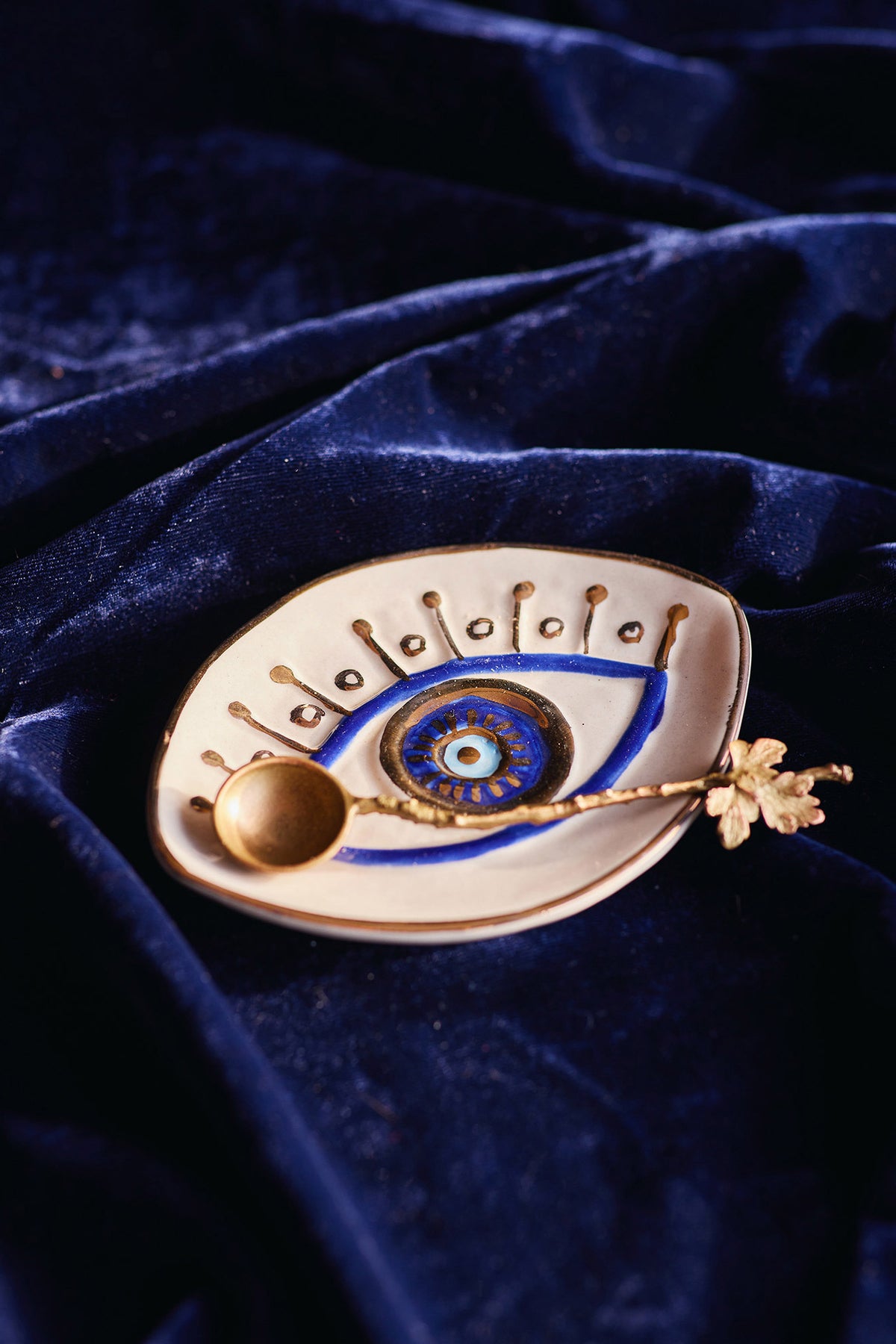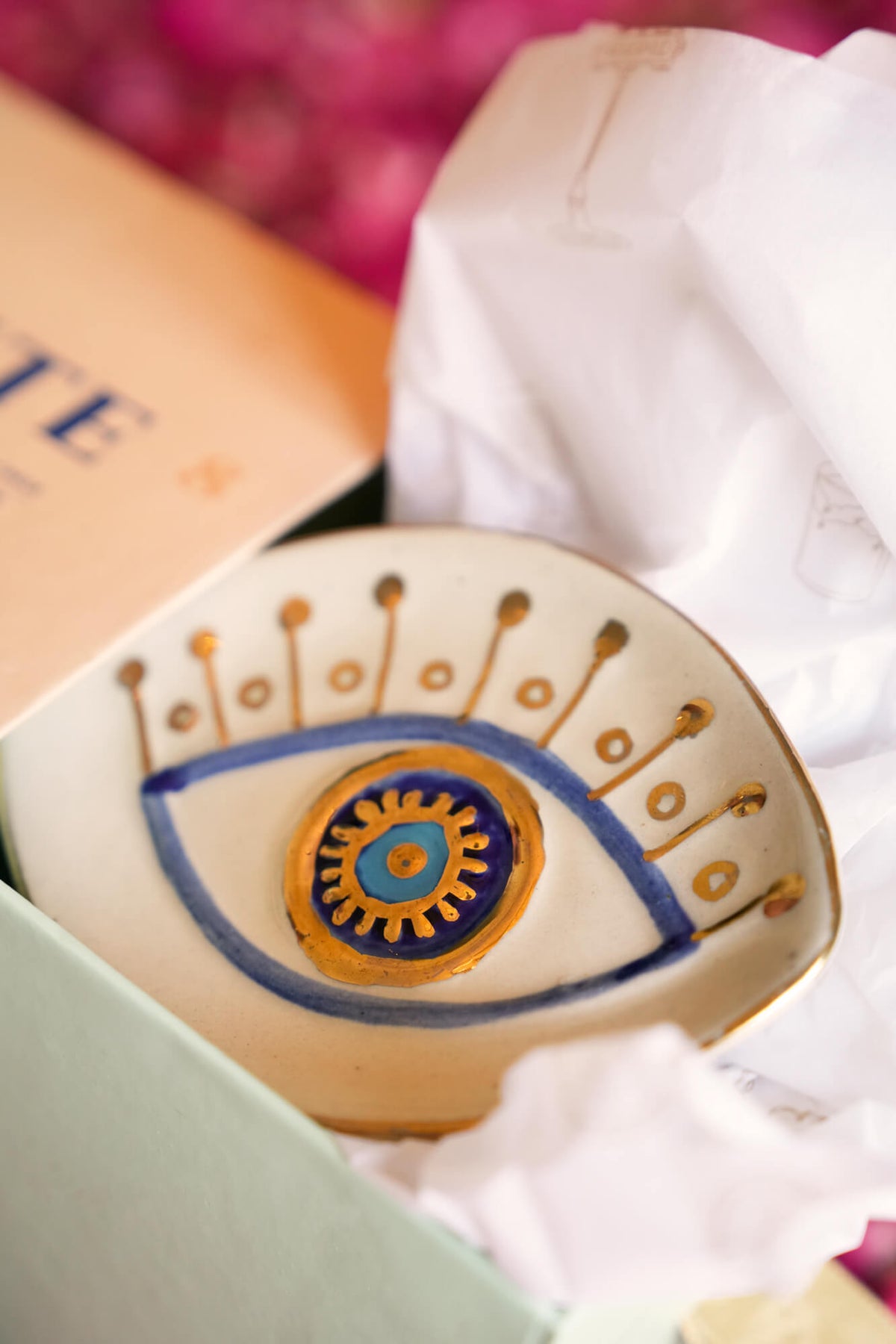The iconic protective eye takes center stage in this handcrafted trinket dish, echoing the rich jewel tones, glowing lanterns and velvet corners of El Fenn. Each piece is delicately embossed and debossed, then hand-painted with gold accents that shimmer beautifully in the light.