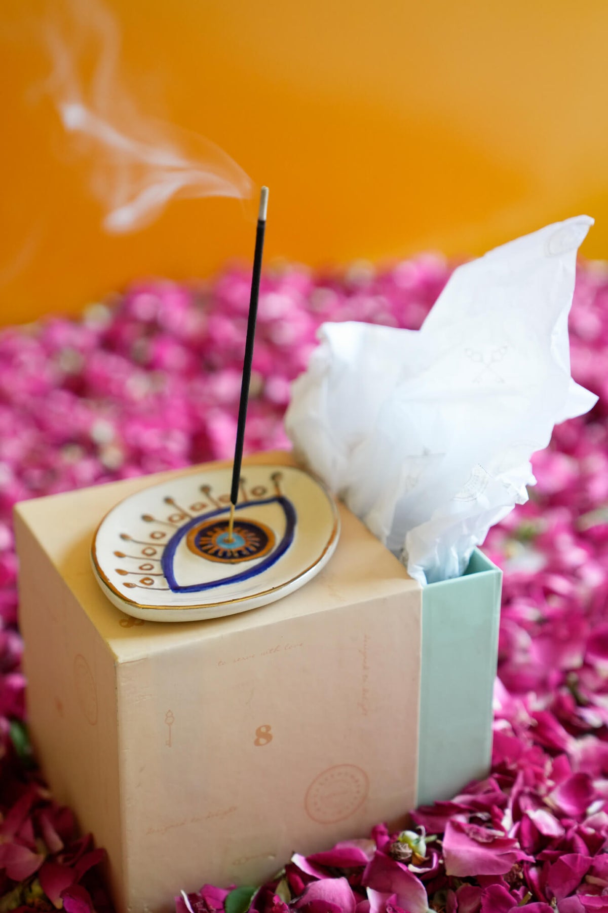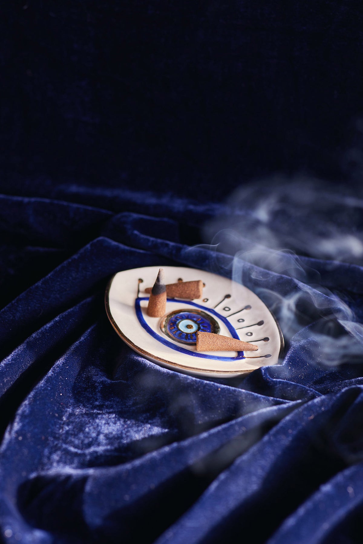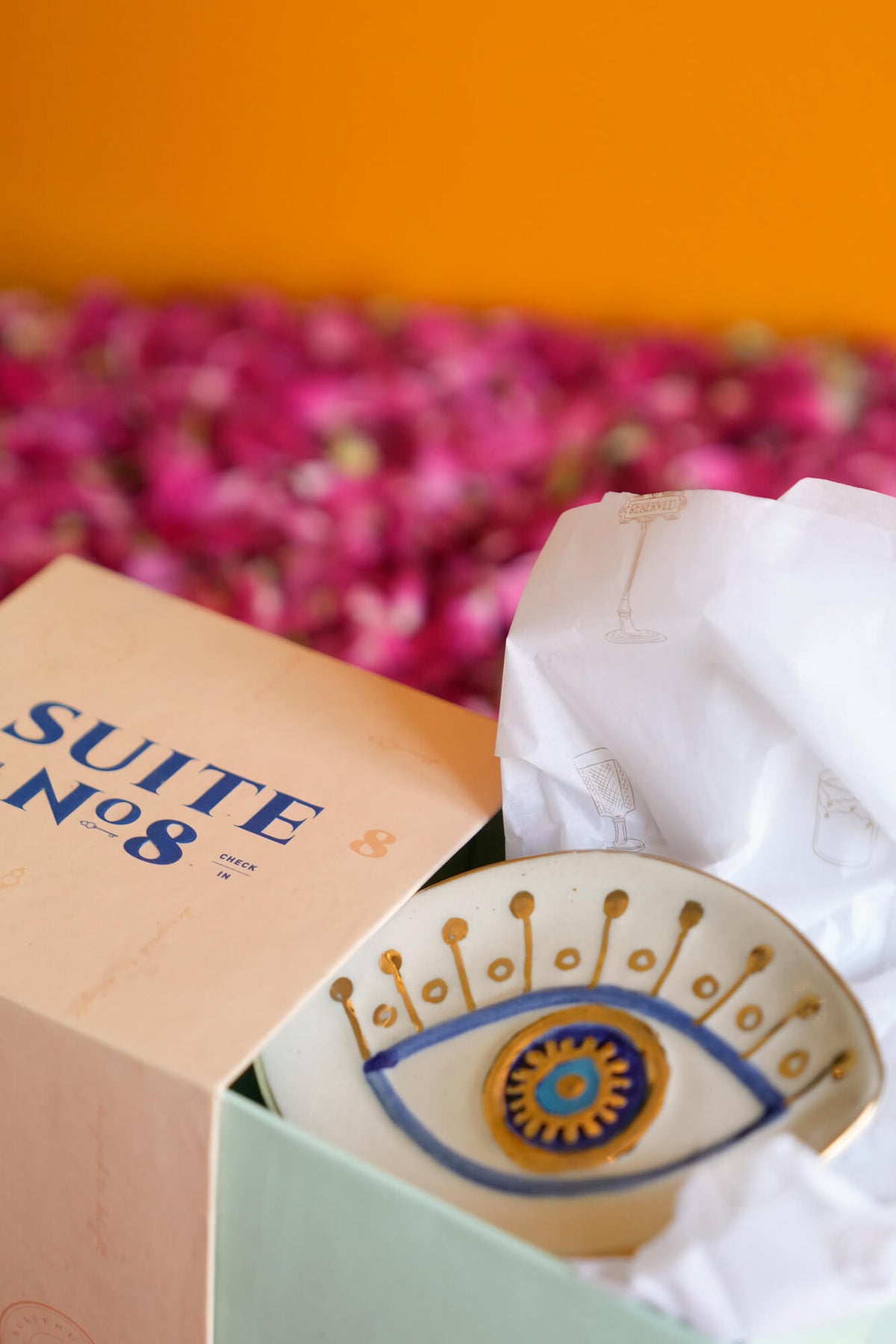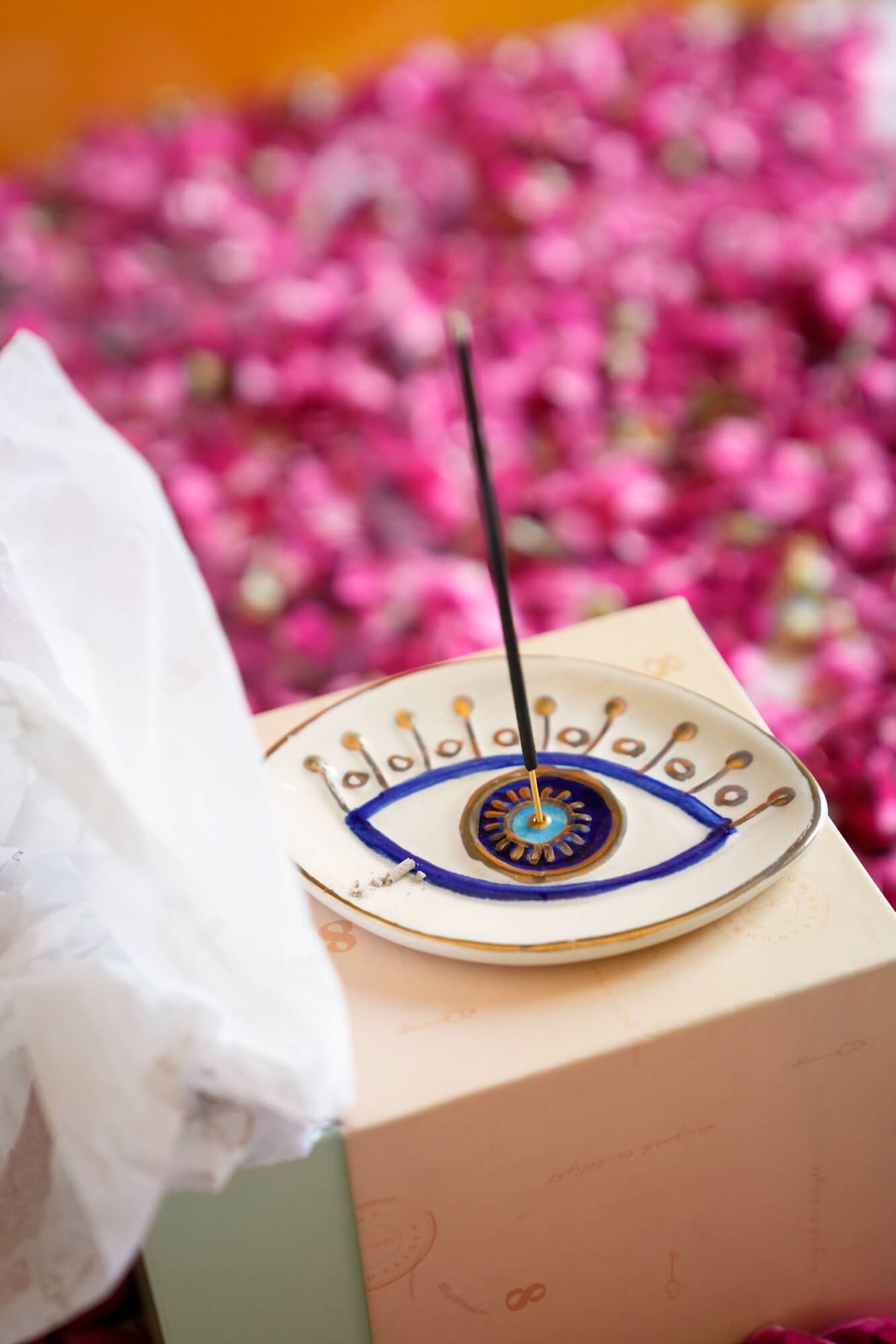The iconic protective eye takes center stage in this handcrafted trinket dish, echoing the rich jewel tones, glowing lanterns and velvet corners of El Fenn. Each piece is delicately embossed and debossed, then hand-painted with gold accents that shimmer beautifully in the light.