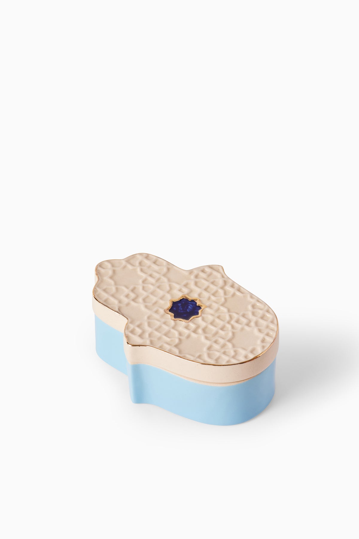 The Hamsa is an ancient symbol long revered for its power to ward off the evil eye and invite blessings, prosperity and abundance. Paired with the eight-point star, a universal emblem of balance, harmony and cosmic order, our Hamsa Jar reflects faith, wisdom and an enduring appreciation of beauty.